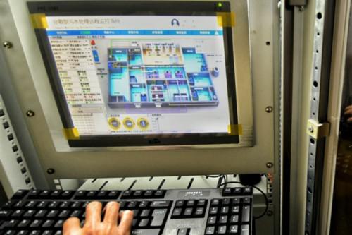 圖為監(jiān)控室管理平臺顯示的污水COD、氨氮、PH值等多項(xiàng)關(guān)鍵水質(zhì)指標(biāo)。